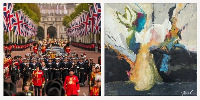 Some of the paintings from that course moved beyond gardens but still connects with them. Flowers for a Queen’s Funeral came to life while I was watching Queen Elizabeth II’s funeral. I wasn’t trying to paint it, but I saw a woman gathering flowers for a vase and I felt it interesting. For other works, I imagined the kinds of creatures that might live in these internal gardens.